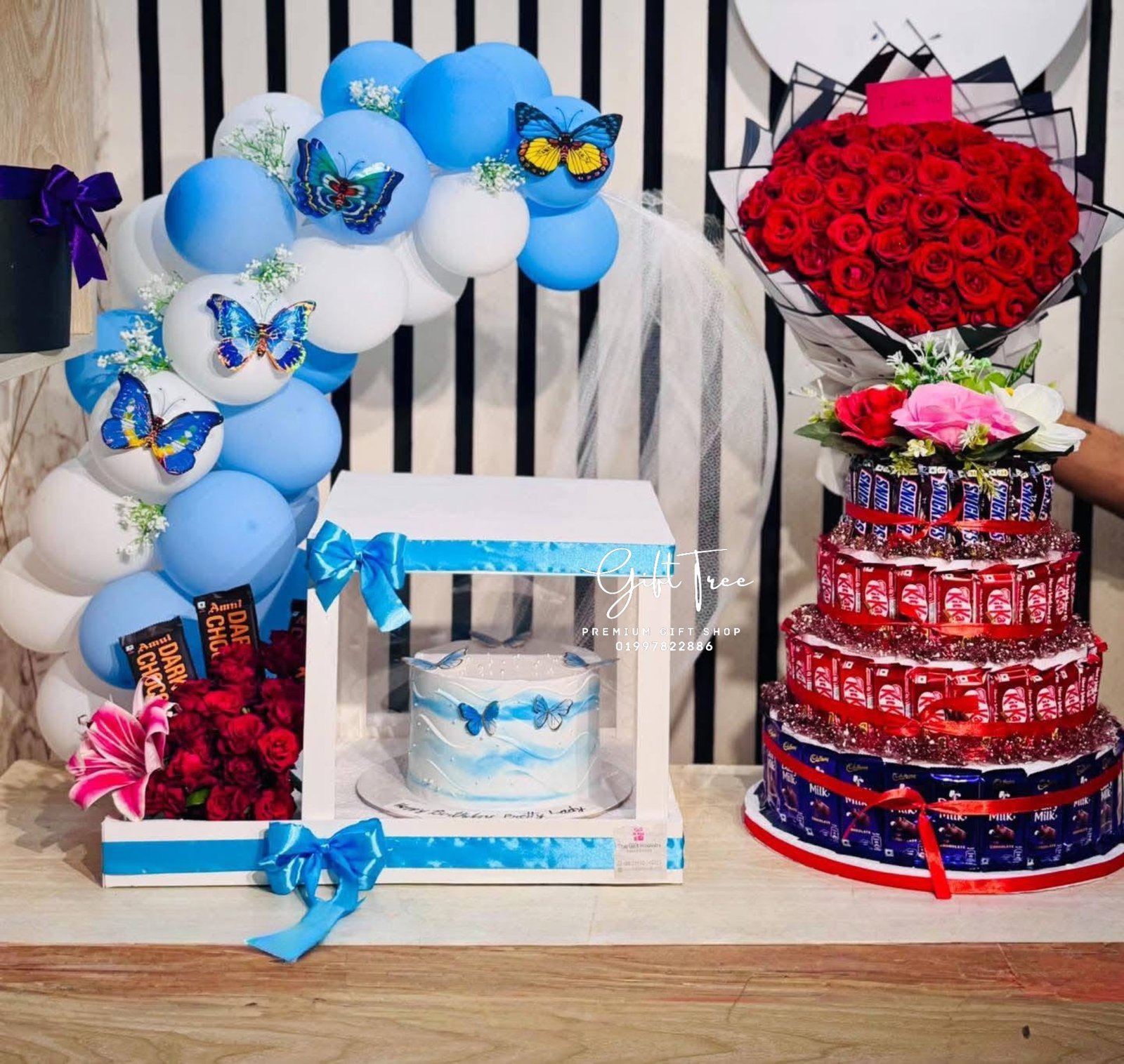 Chcooclate Tower With Flowers Bouquet and Cake with Balloon Decoration