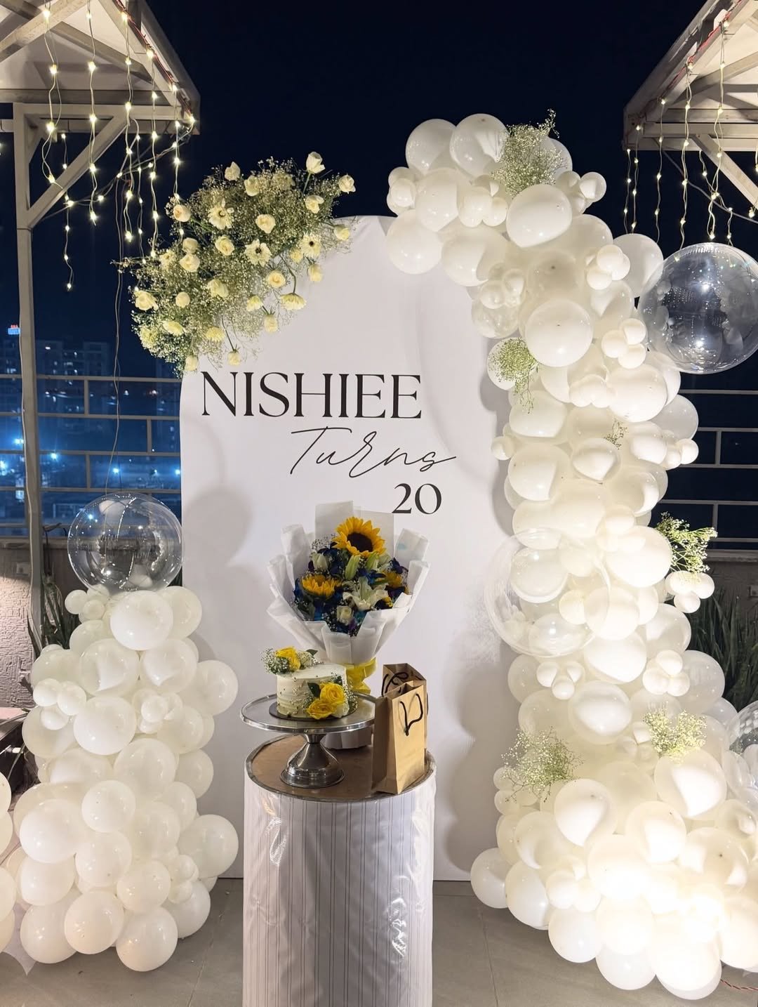 Elegant White Balloon Birthday Setup with Custom Name Backdrop