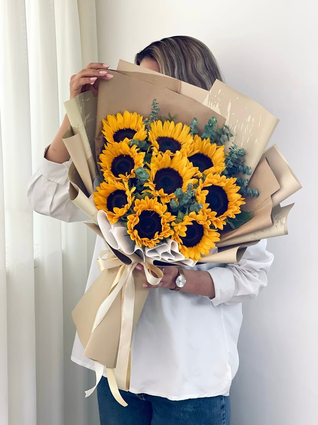 Sunflowers symbolize happiness, strength, and optimism, while eucalyptus adds a soft, refreshing touch that enhances the overall harmony of the arrangement. Carefully hand-arranged with attention to freshness and proportion, this bouquet feels modern, airy, and naturally graceful. Its understated elegance makes it suitable for both joyful celebrations and meaningful everyday moments.