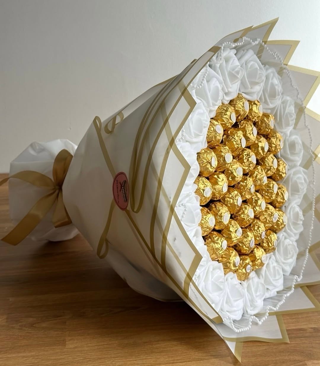 A luxurious Ferrero Rocher bouquet made with 34 premium chocolates and elegant white artificial flowers. Perfect for birthdays, anniversaries, love surprises, and sophisticated gifting in Dhaka.