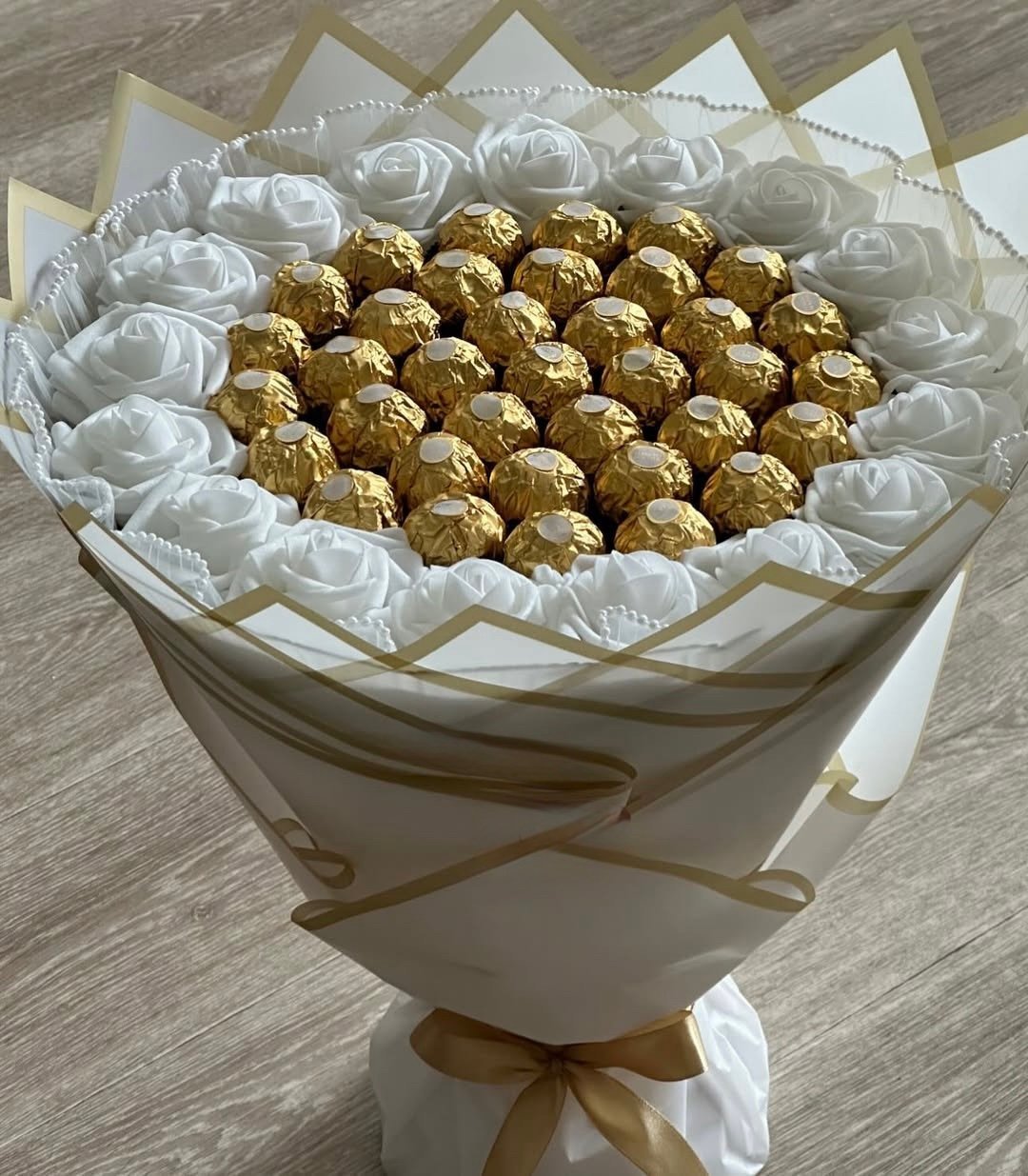 Complementing the chocolates are white artificial flowers, chosen for their elegant appearance and long-lasting beauty. White flowers represent purity, admiration, and sophistication, adding a graceful and refined touch to the bouquet. Unlike fresh flowers, artificial blooms ensure the bouquet remains beautiful for a long time, making it a memorable keepsake even after the chocolates are enjoyed.