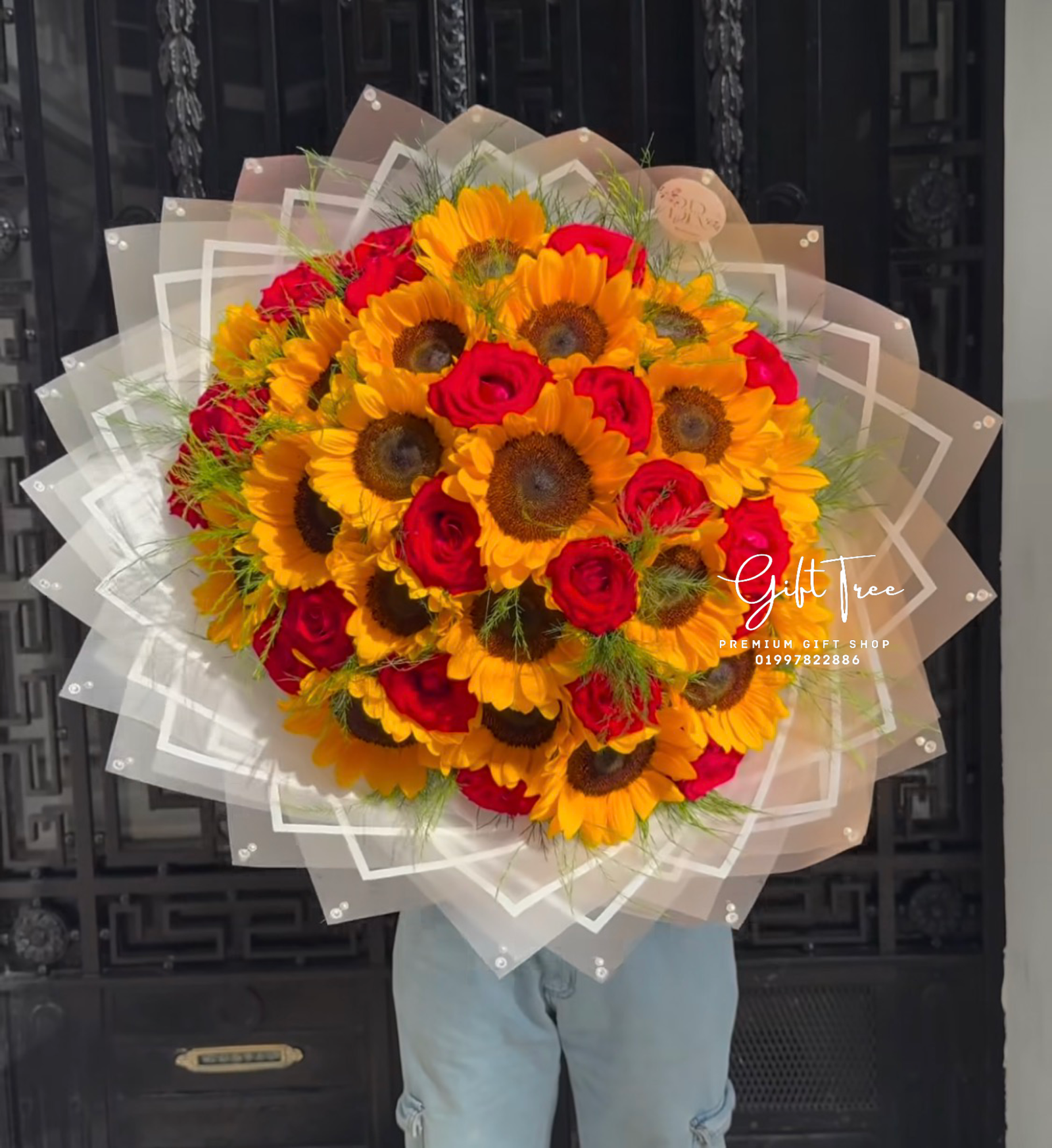 Make every moment memorable with the Grand Red Rose & Sunflower Bouquet. Featuring rich, velvety red roses paired with cheerful, golden sunflowers, this bouquet creates a striking contrast that exudes elegance and warmth. Perfect for anniversaries, birthdays, romantic gestures, or to simply brighten someone’s day, it conveys heartfelt emotions with style and charm.