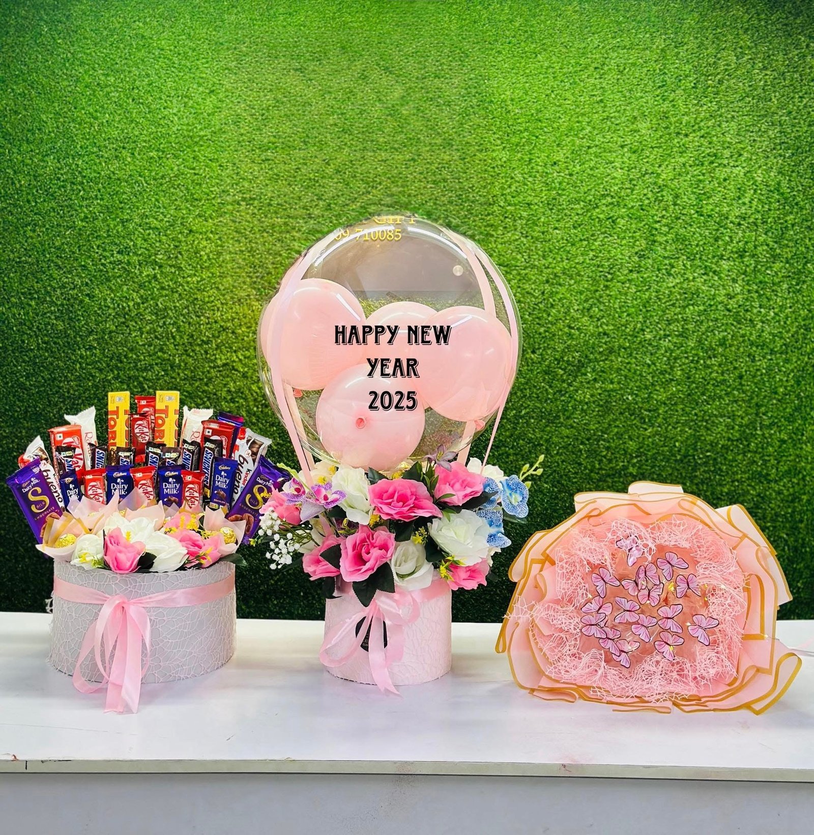 This elegant New Year 2026 gift set is created for meaningful celebrations. At the center, a transparent balloon arrangement with “Happy New Year 2026” brings a festive glow, paired with soft-toned artificial flowers that last beyond the day.
