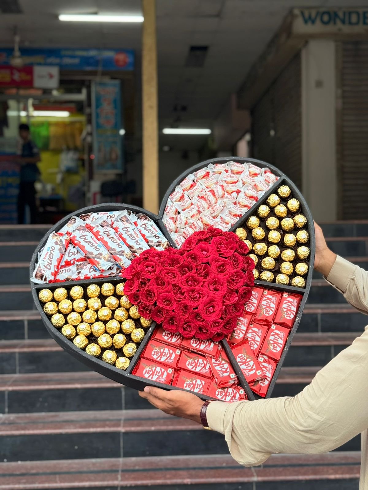 Show your love with this elegant heart-shaped gift box filled with Kinder Bueno, Ferrero Rocher, Raffaello, KitKat, and fresh roses—a sweet gesture that speaks from the heart.
