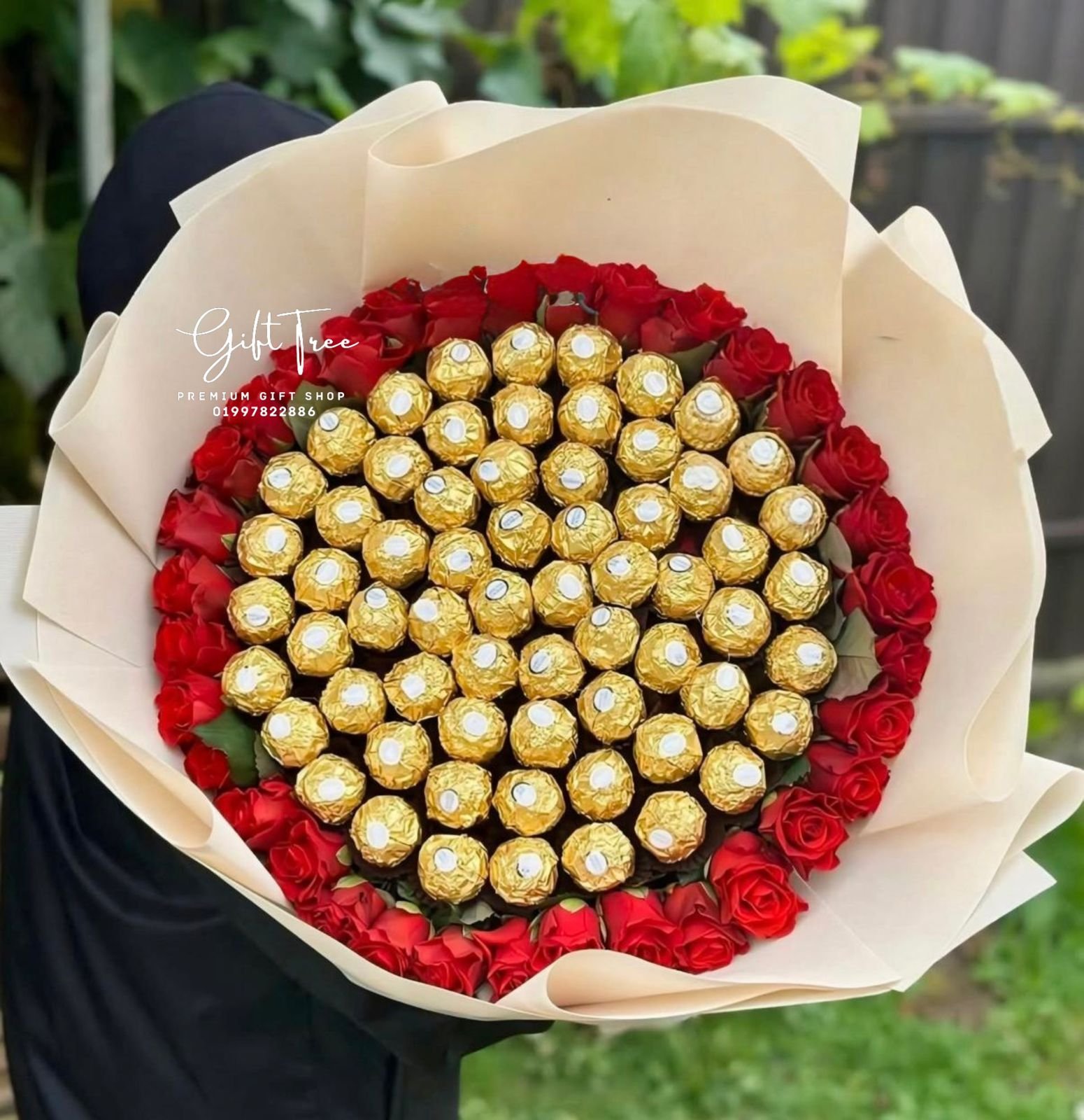 The Large Ferrero Rocher Chocolate Bouquet with Rose is designed to make a bold and heartfelt impression. Featuring a generous arrangement of Ferrero Rocher chocolates, this bouquet stands out with its full, luxurious look. The addition of a fresh rose brings warmth and romance, creating a perfect balance between sweetness and emotion.
