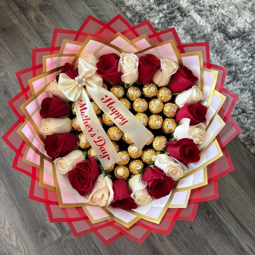 A heartfelt Mother’s Day gift featuring 12 red and 12 white roses, 24 Ferrero Rocher chocolates, and a “Happy Mother’s Day” ribbon. Elegant, loving, and memorable.