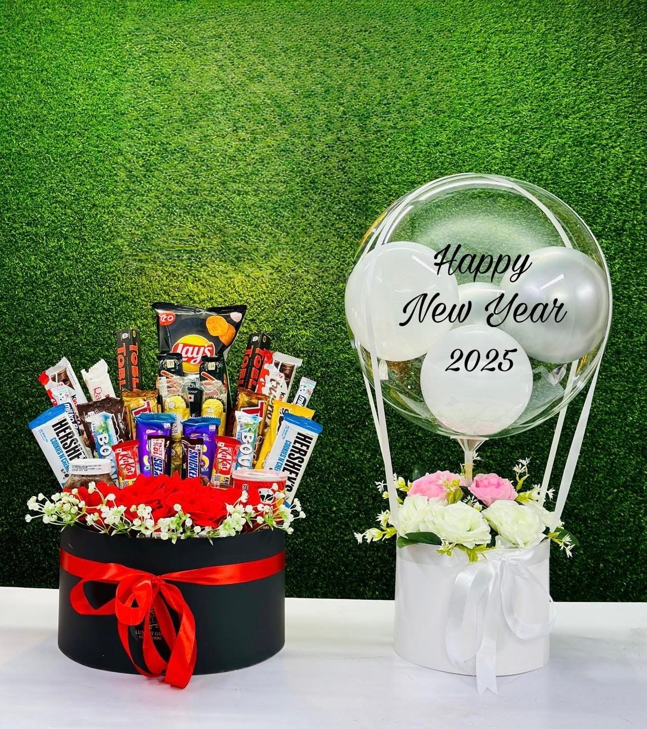 Alongside the chocolate box, an elegant balloon arrangement completes the set. The transparent balloon features a “Happy New Year 2025” message and is paired with an artificial floral base for long-lasting beauty. This combination makes the gift both joyful and lasting—perfect for celebrations at home or as a surprise delivery.