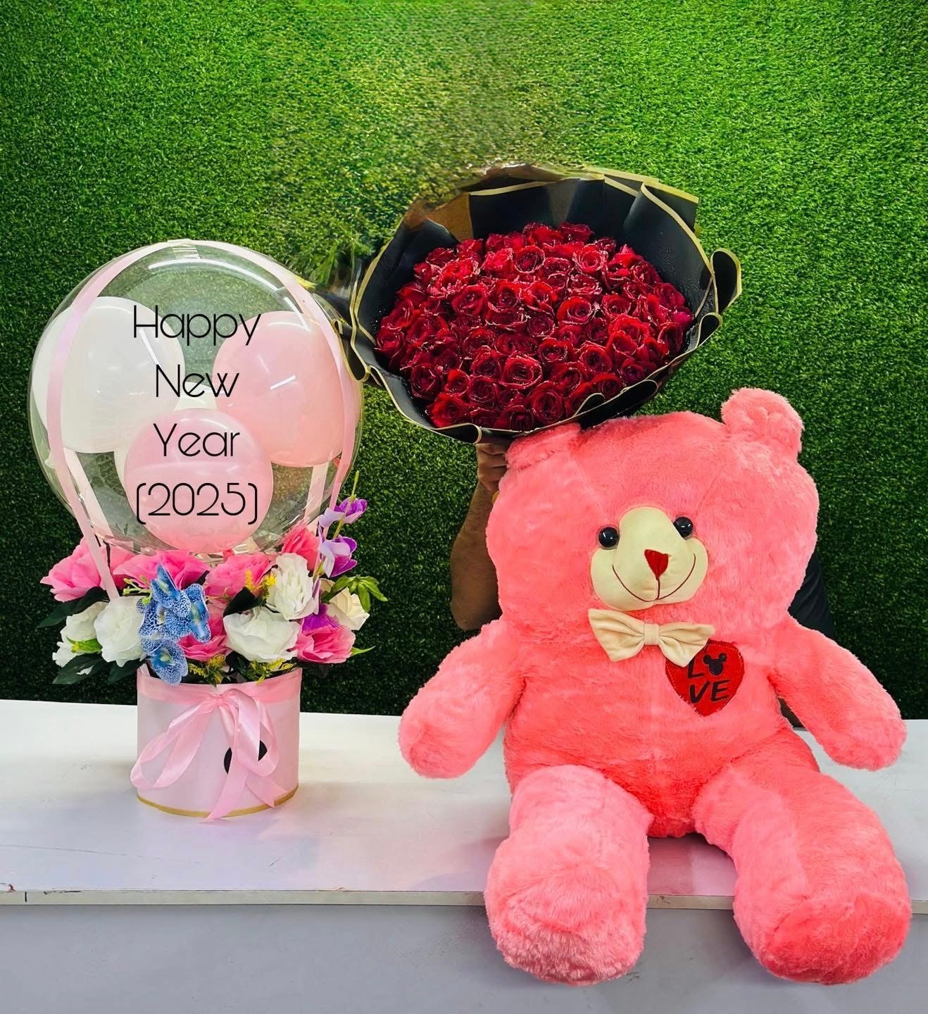 This premium New Year gift set brings together three powerful elements of love and celebration. A clear “Happy New Year 2025” balloon arrangement with soft artificial flowers sets the festive tone. Alongside it, a large soft teddy bear adds comfort and emotional warmth, making the moment feel personal and heartfelt.