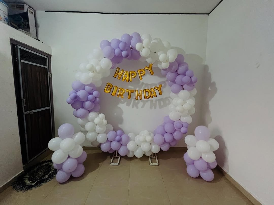 The circular balloon ring is thoughtfully arranged to highlight the “Happy Birthday” banner at the center, making it ideal for photos and intimate celebrations. The side balloon clusters add balance to the setup, giving it a complete and polished look without feeling too heavy.