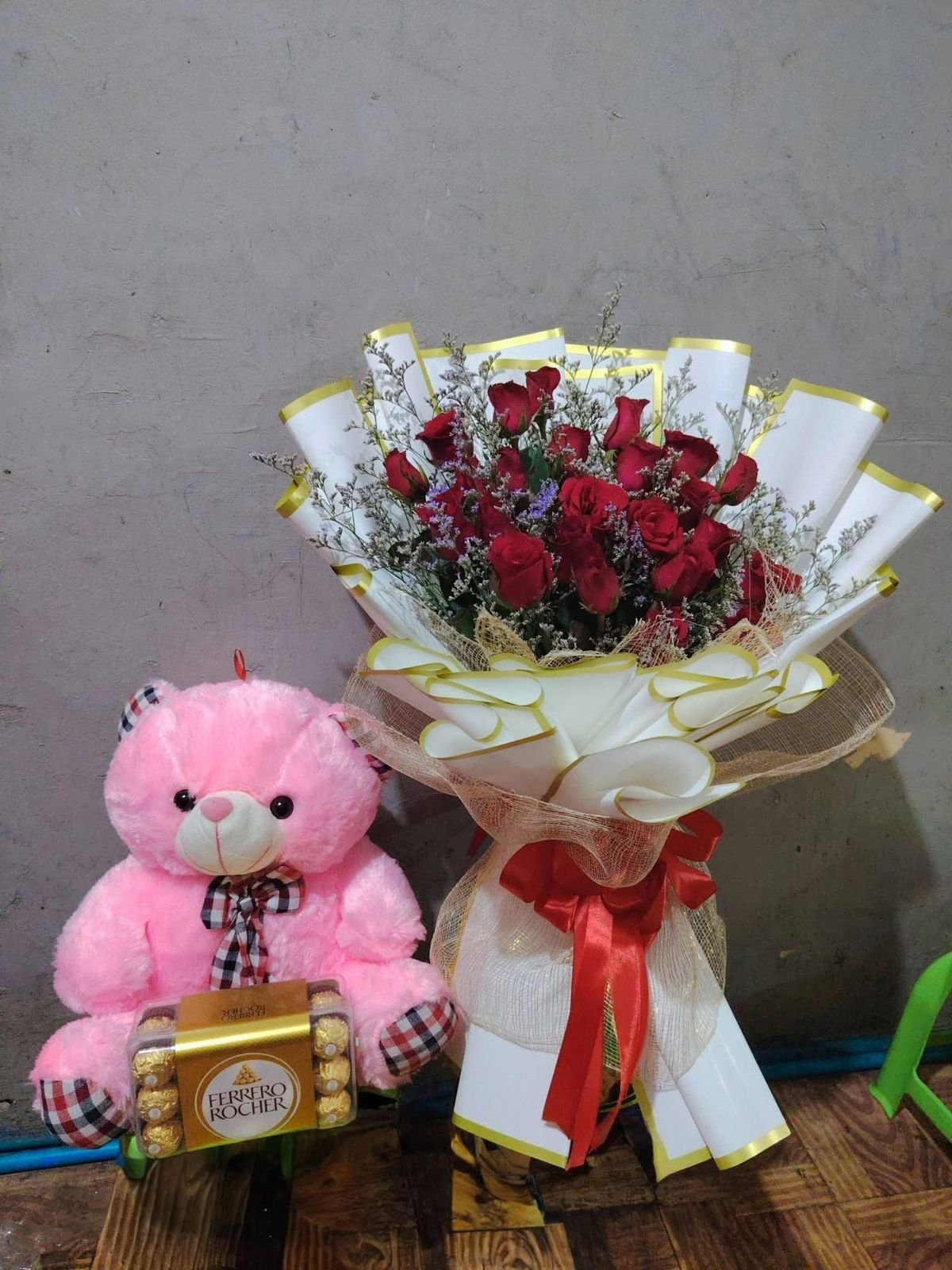 A romantic and heartwarming gift featuring fresh red roses, a soft pink teddy bear, and Ferrero Rocher chocolates. Simple, expressive, and full of feeling.