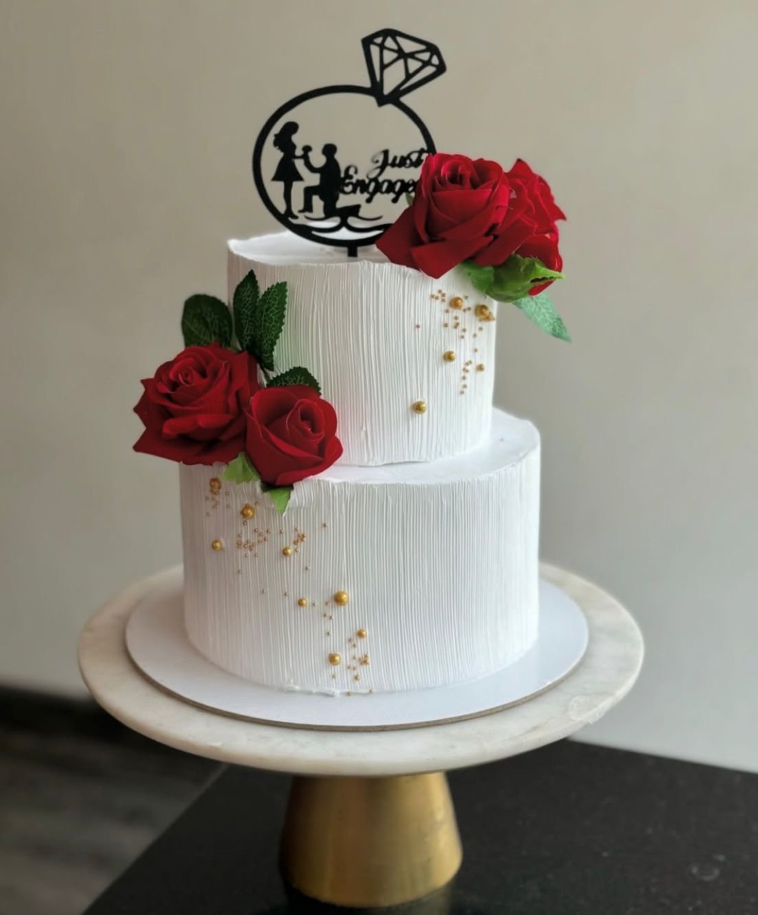A graceful two-tier engagement cake adorned with fresh red roses—elegant, romantic, and beautifully suited for celebrating a meaningful beginning.